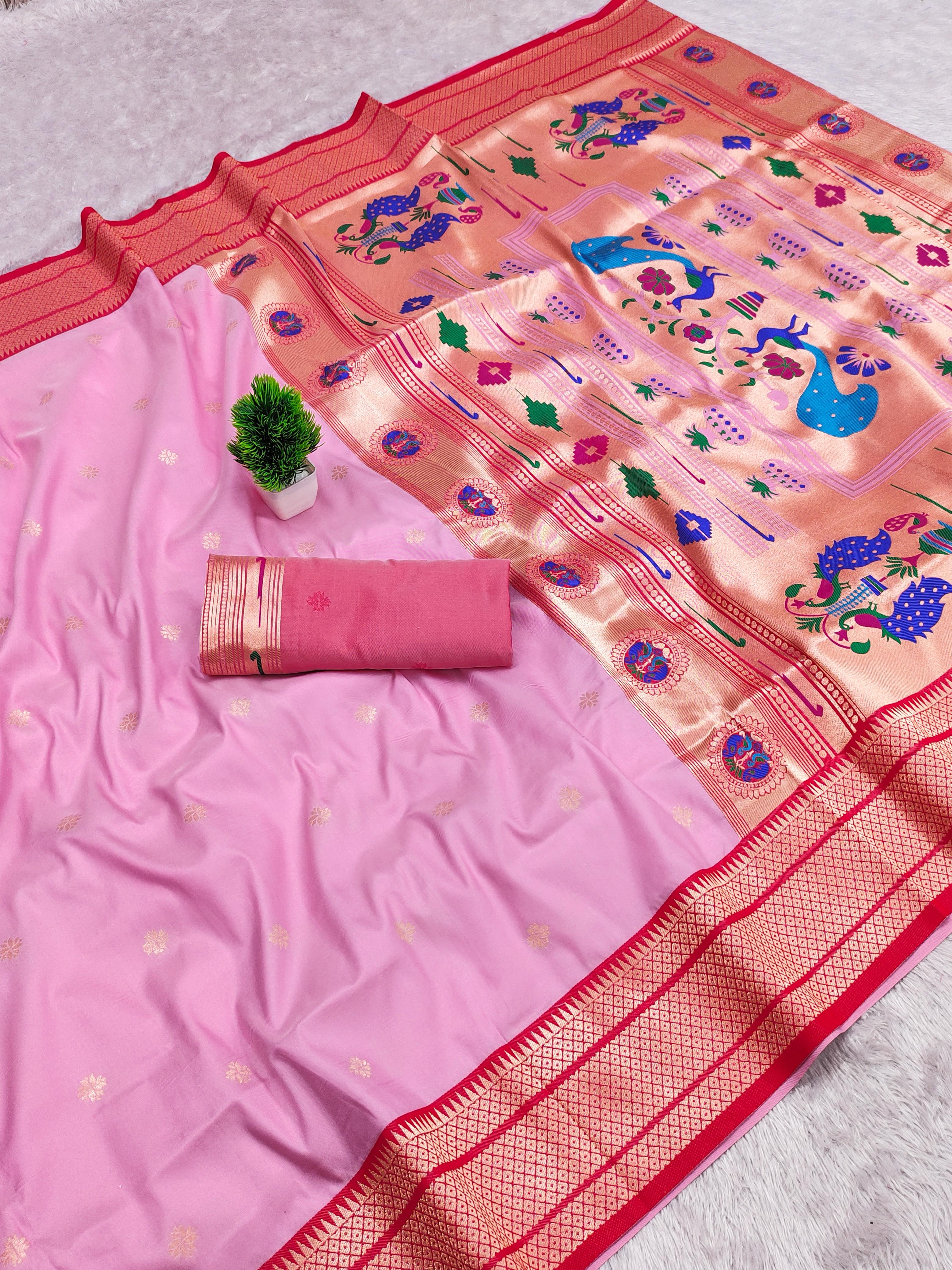 Elevate your ethnic wardrobe with this exquisite Paithani Silk Saree, crafted from pure soft Narayanpet Paithani silk. Designed with original pure zari weaving, the saree features a rich Minakari traditional pallu and border that reflect timeless elegance. Paired with a contrast jacquard weaving blouse with heavy zari patta, this saree is a perfect blend of tradition and sophistication. Ideal for weddings, festive occasions, and cultural celebrations, it is a statement piece that embodies luxury and heritage.