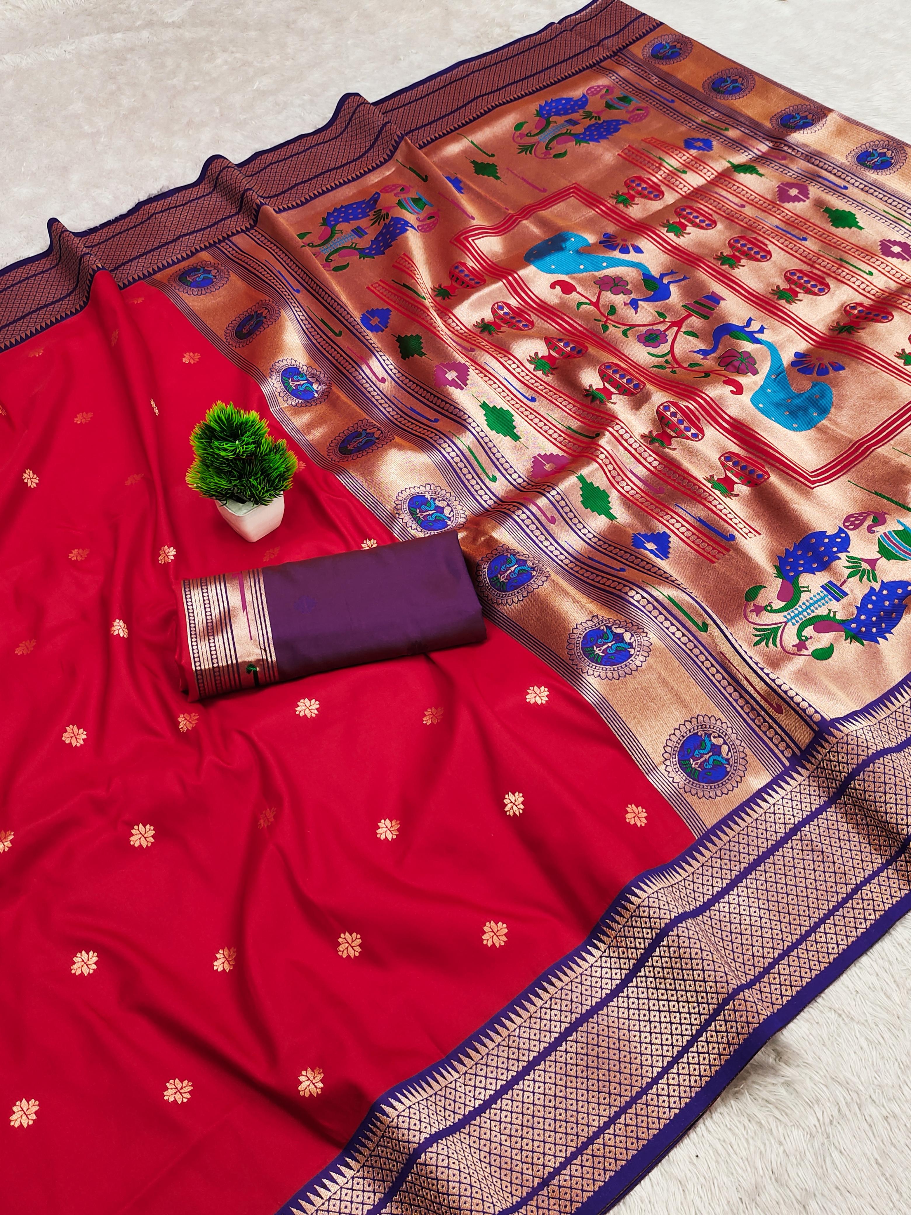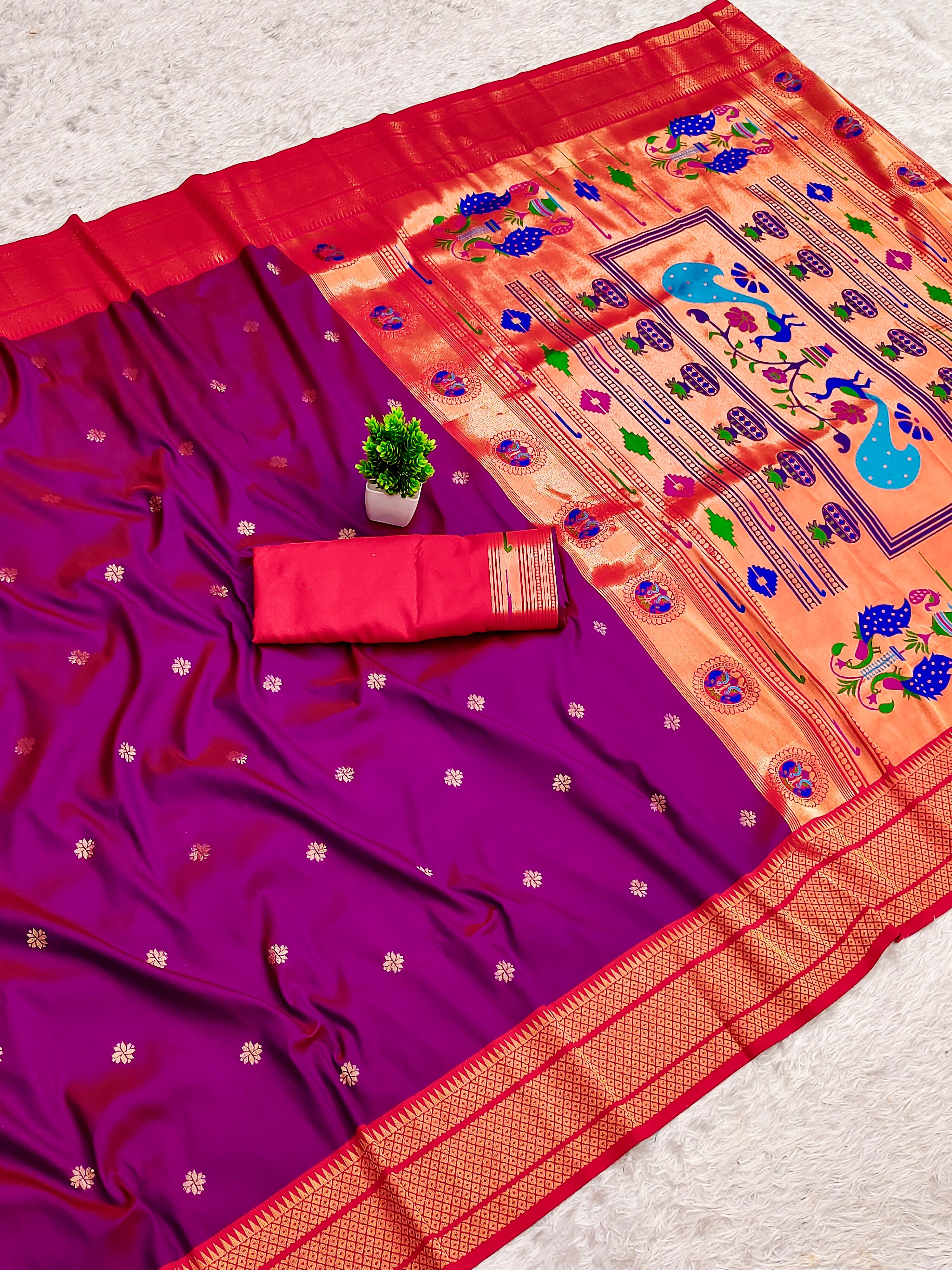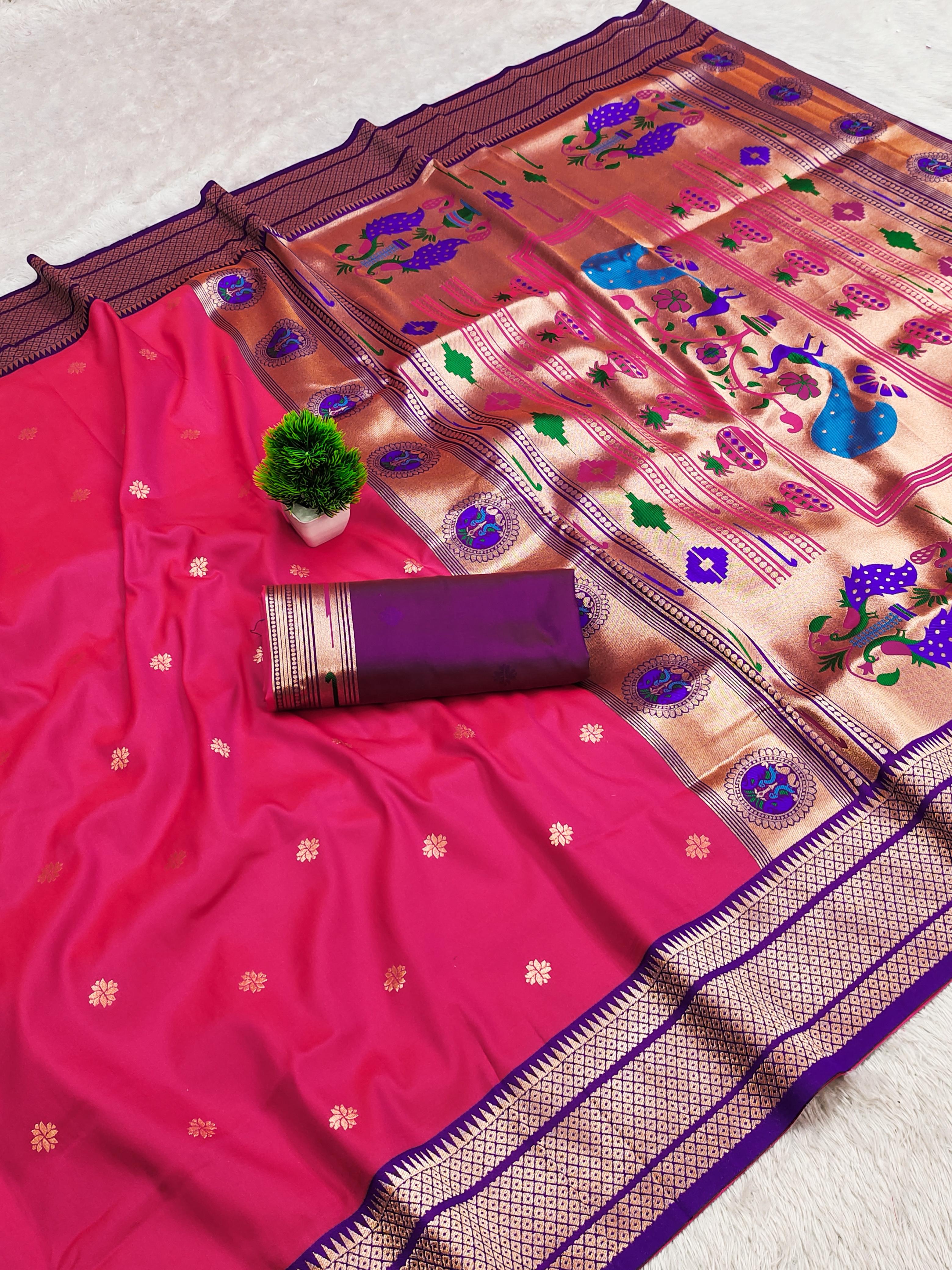Elevate your ethnic wardrobe with this exquisite Paithani Silk Saree, crafted from pure soft Narayanpet Paithani silk. Designed with original pure zari weaving, the saree features a rich Minakari traditional pallu and border that reflect timeless elegance. Paired with a contrast jacquard weaving blouse with heavy zari patta, this saree is a perfect blend of tradition and sophistication. Ideal for weddings, festive occasions, and cultural celebrations, it is a statement piece that embodies luxury and heritage.